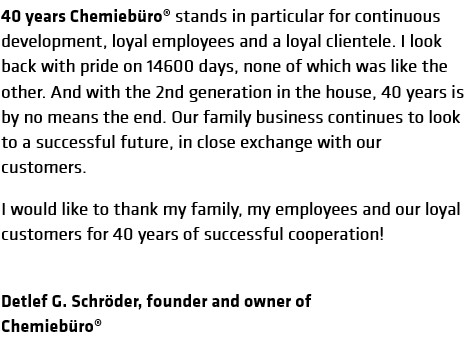 | 2022 marks the 40th anniversary of Chemiebüro®! With pride we look back on four successful decades, which would not have been possible without the loyalty and commitment of the employees and the loyal customers of Chemiebüro. | |